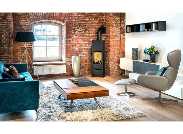 Качественная скандинавская печь с большим стеклом и умеренной мощностью.